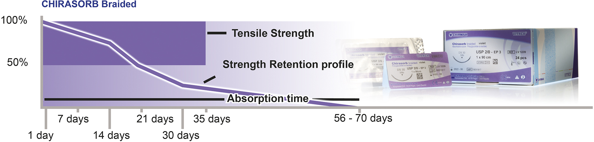 Chirasorb® er en absorberbar sutur med middel nedbrydningsprofil. Her er tale om en flettet multifilament sutur af Poly(glycolide-co-lactide).