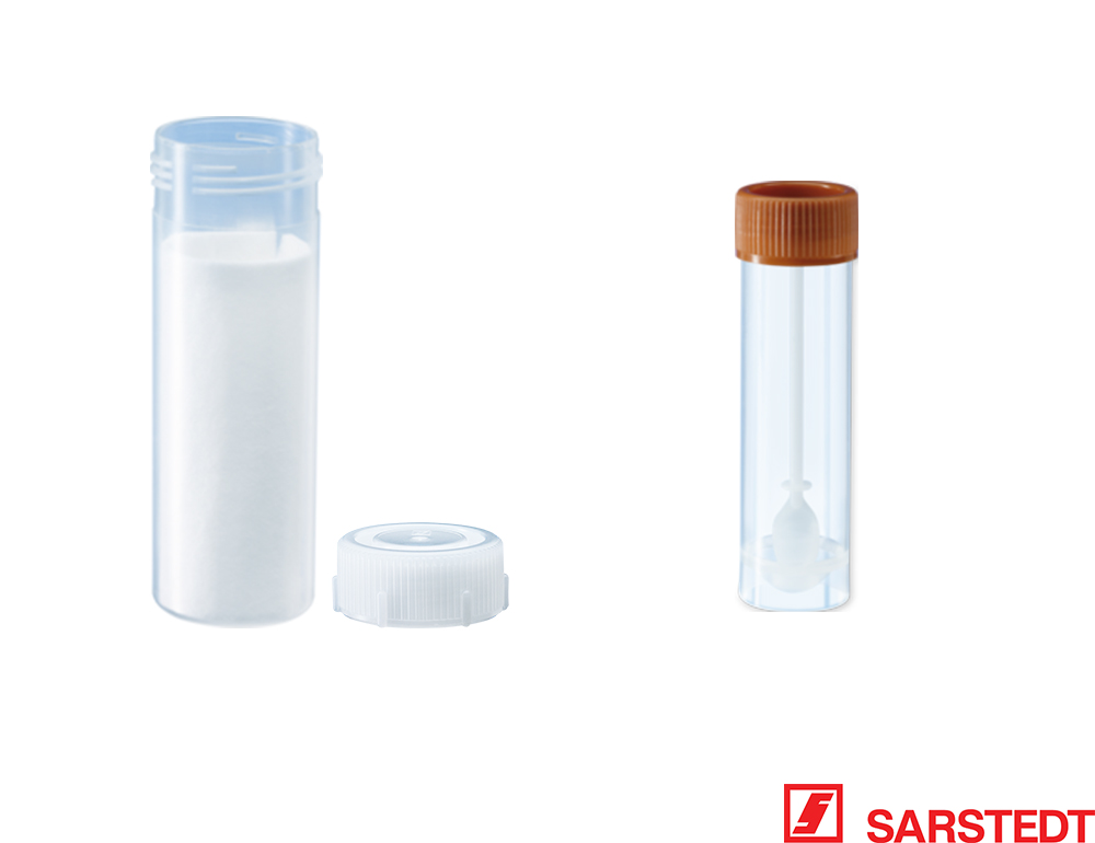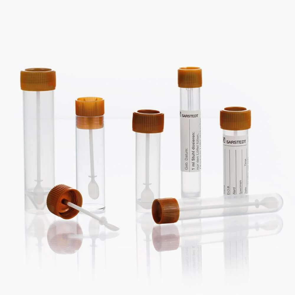 SARSTEDT fæcesrør fås enten sterile eller usterile og med eller uden ståring, samt i en praktisk sampak med tilhørende forsendelsesrør og sugeindlæg.