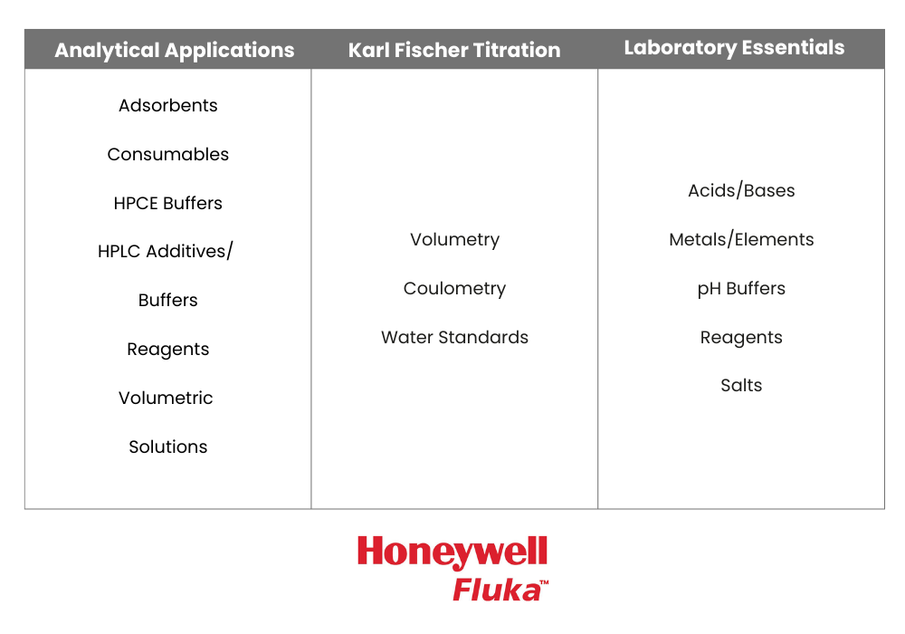 Honeywell Fluka™ er en serie af reagenser og uorganiske kemikalier, der egner sig til en bred vifte af analytiske applikationer. Fluka™ inkluderer brands som Hydranal™ til Karl Fischer Titrering og TraceSELECT Inorganics til måling af trace og low-metal indhold. Derudover tilbydes diverse syrer, baser, salte og pH-buffere.
