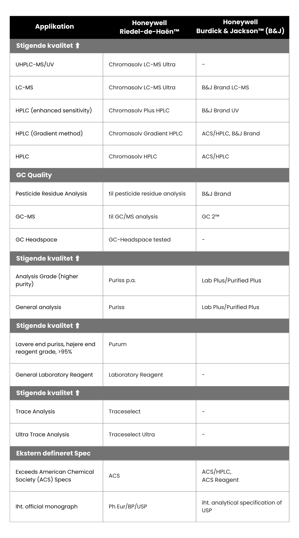Oversigt over renhedsgraden af Honeywell Riedel-de Haën™ og Honeywell Burdick & Jackson™ kemikalier.