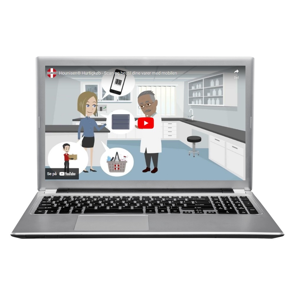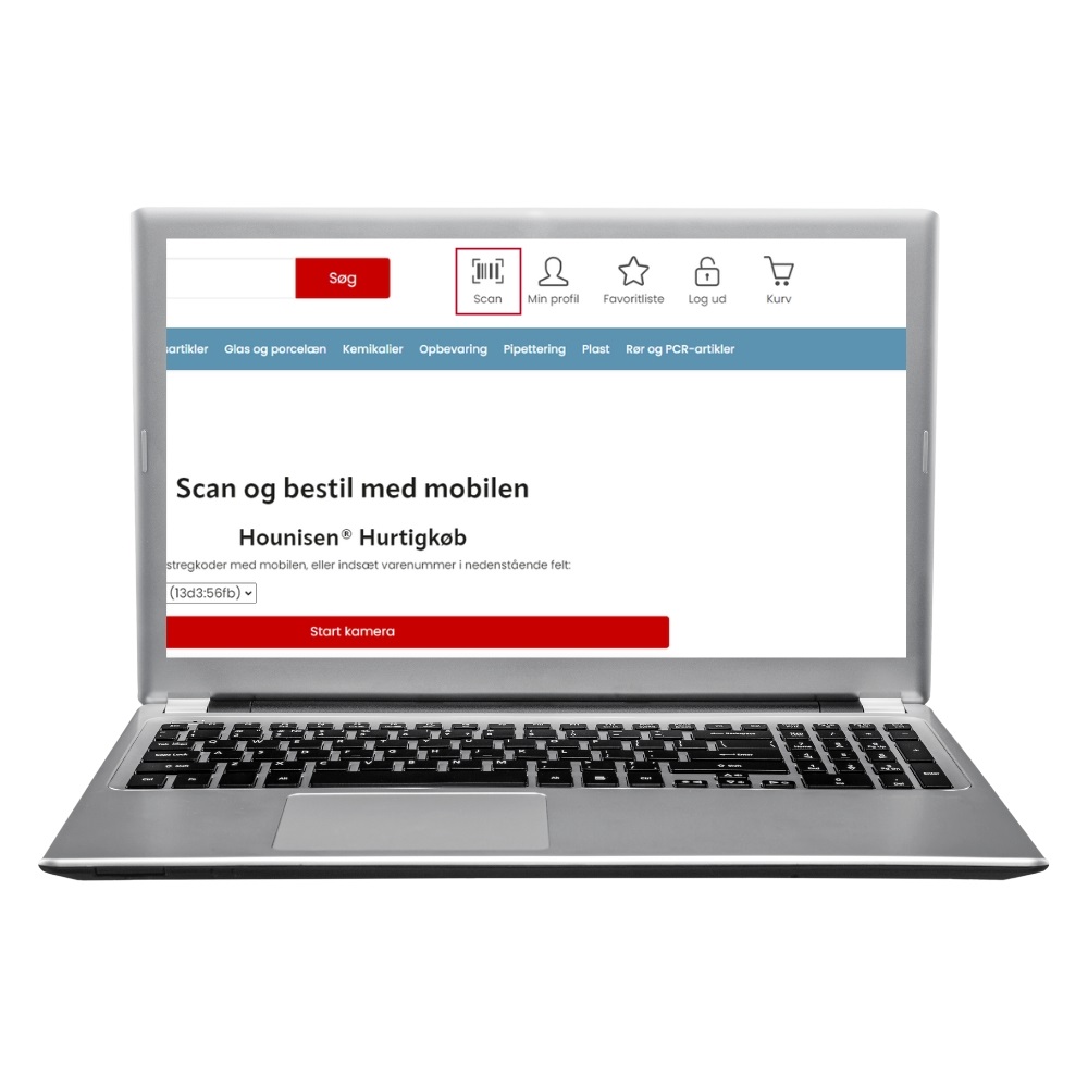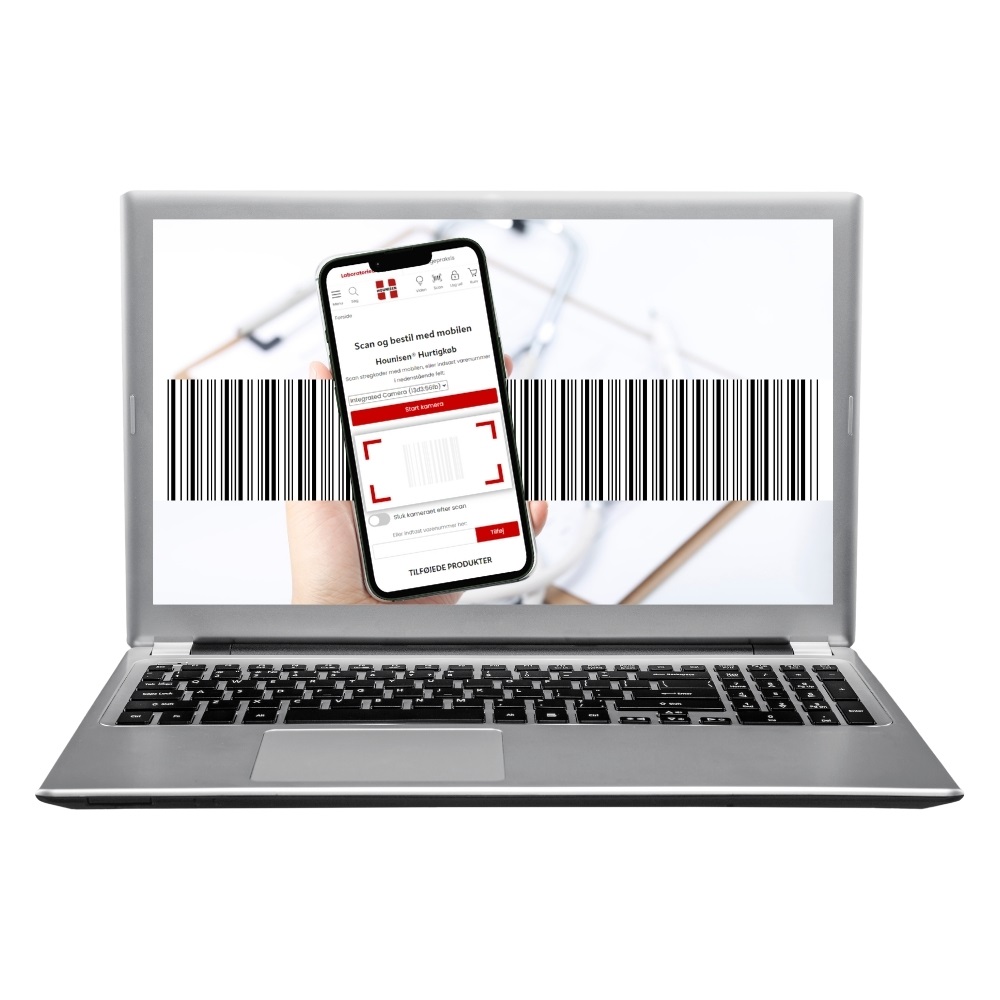 Hounisen® Hurtigkøb er et tilbud til dig, der har brug for at bestille varer fra et fysisk lager. Du scanner stregkoden på de varer, du ønsker at bestille, og varerne føjes automatisk til din indkøbskurv.