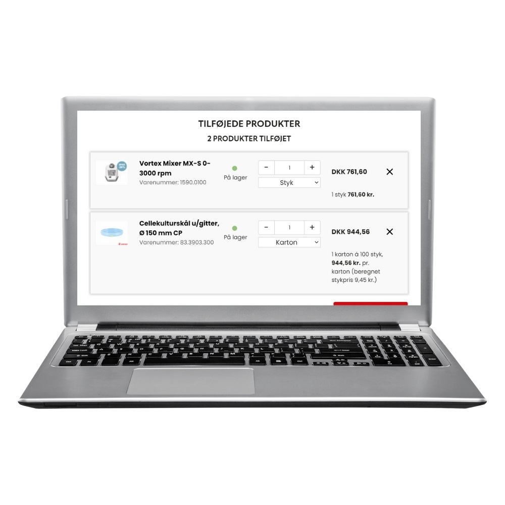 Dine varer tilføjes løbende en bestillingsliste, der fremkommer under kameraet. Her kan du se varens pris, salgsenhed (typisk styk, pakke eller karton) og antal. Du kan nemt ændre i din bestilling (justere op/ned i mængde), så det passer til jeres aktuelle forbrug. Du kan også slette enkelte varer, eller fjerne alle varer på listen ved et klik på 'Tøm kurv'.