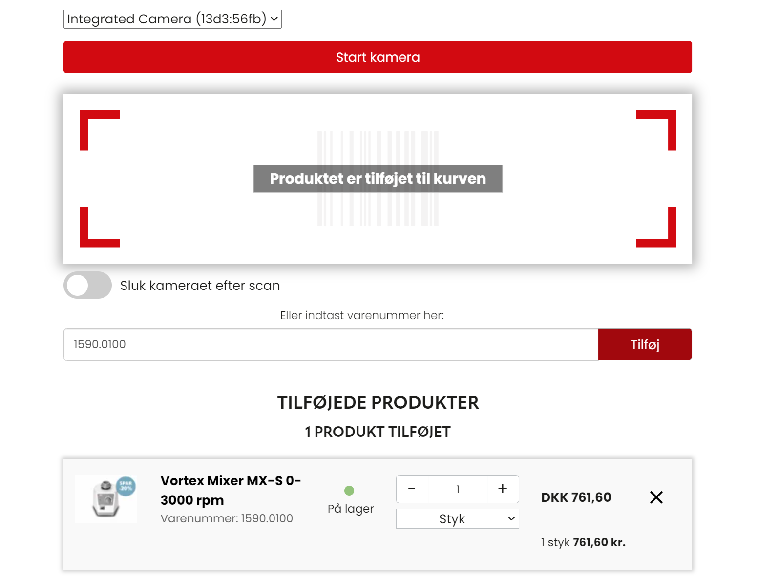 Tip: Hvis du scanner producentens varenummer, og du ser en grøn markering på skærmen, men varen ikke automatisk tilføjes kurven, kan du trykke på knappen Tilføj nedenunder kameraet. - Du kan se en liste med alle varer, der er tilføjet kurven, nederst på scanningssiden. Du du kan ændre i bestillingantal eller slette dele af din ordre, inden du afslutter din bestilling via et tryk på knappen Gå til kassen.