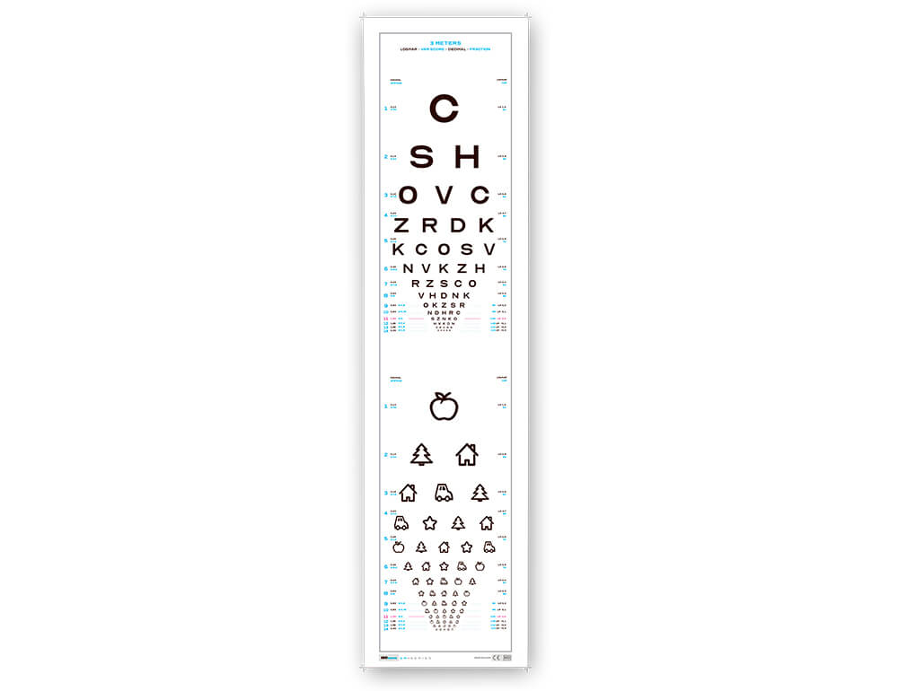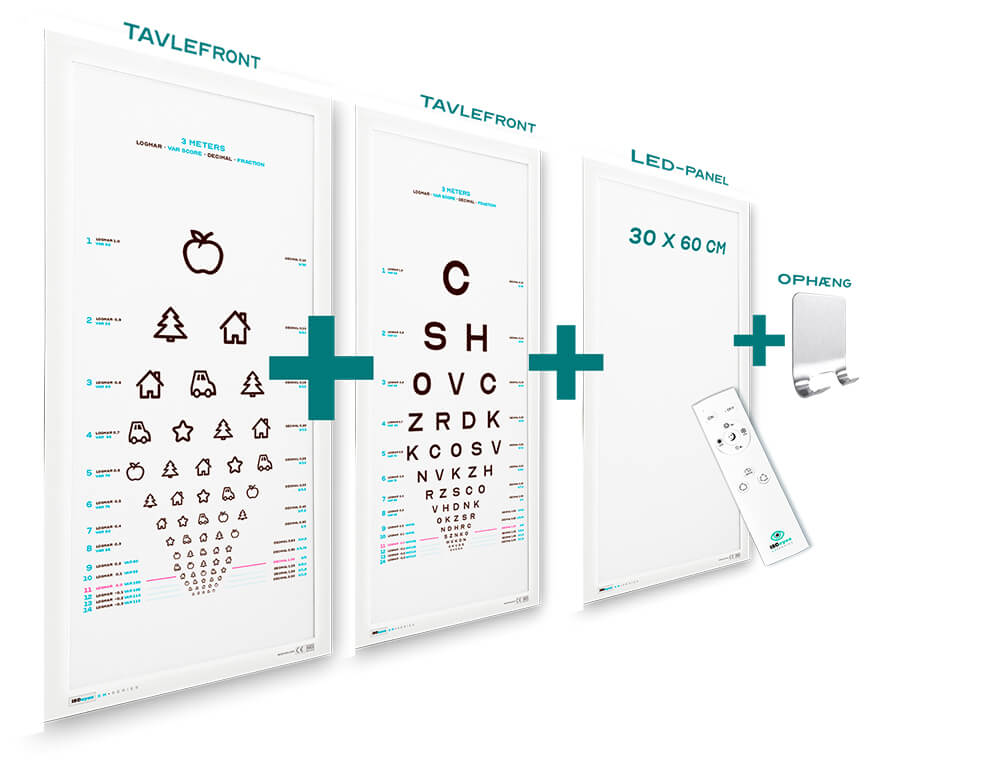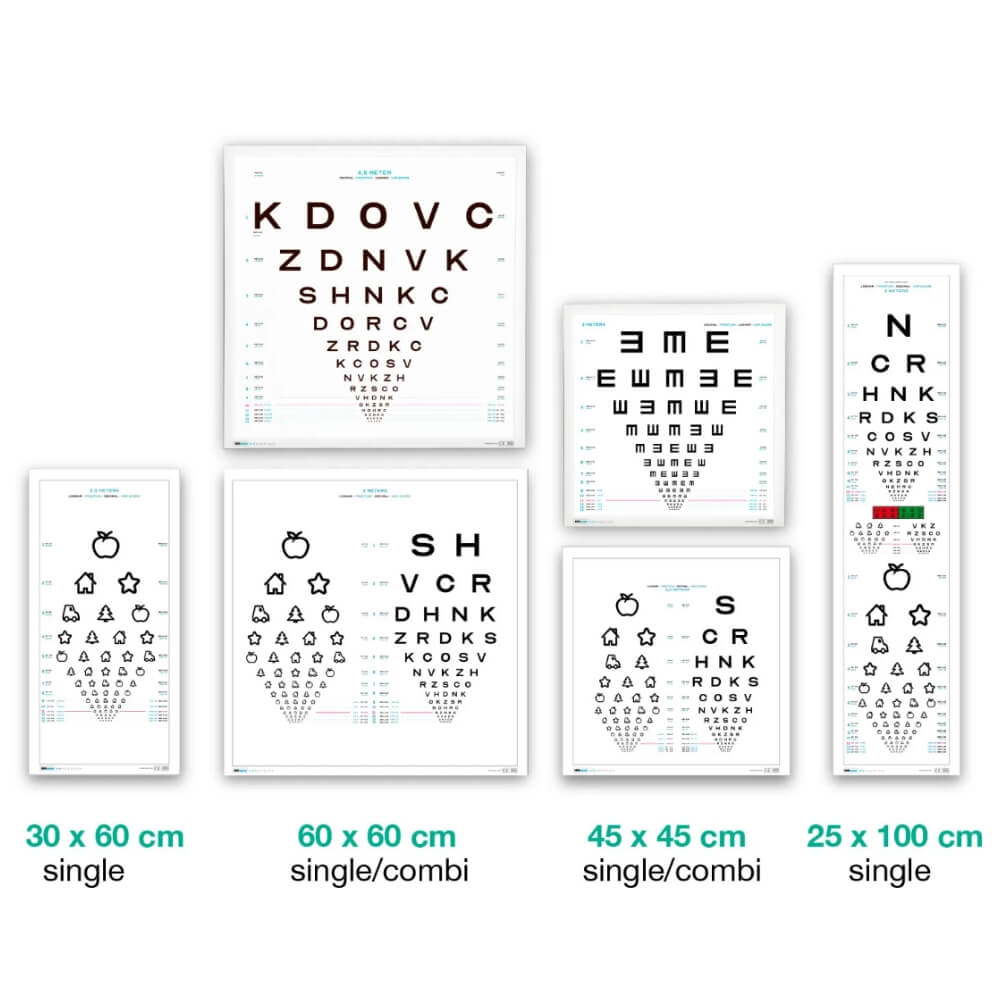 - Bredt udvalg (4 størrelser, 8 optotyper) med mulighed for single- og kombitabler.