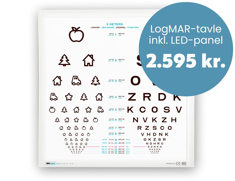 - Overholder ISO-standard 8596-2018-2020 med påført LogMAR-skala, men samtidig med decimalskalaen som reference. Læs mere om LogMAR-skalaen her.
