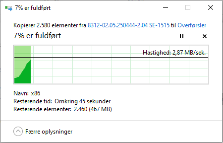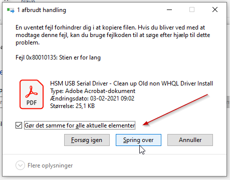 OBS - Der kan fremkomme en dialogboks med '1 afbrudt handling' / 'En uventet fejl' ➜ Sæt flueben i 'Gør det samme for alle aktuelle elementer' ➜ Vælg Spring over