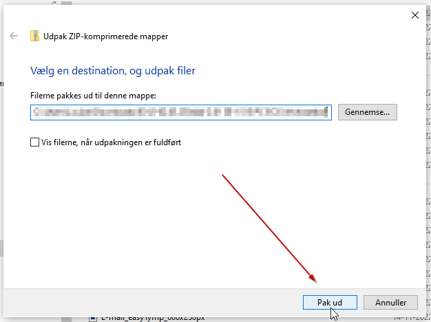 Vælg den mappe, du ønsker filerne placeret i (Gennemse...), eller vælg den placering, computeren selv foreslår (i dette tilfælde Overførsler) ➜ Vælg Pak ud (afvent at jobbet er 100% fuldført)