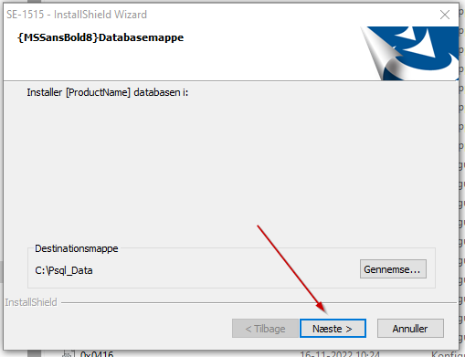 OBS - Version: 2.01: "Installer [ProductName] databasen i" ➜ Vælg Gennemse... eller behold computerens forslag ➜ Klik Næste >