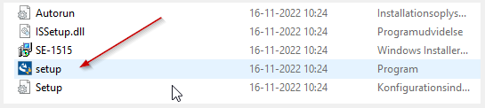 Scroll ned til bunden af listen over emner i mappen ➜ Dobbeltklik på Setup (program) eller Setup.exe ➜ Installationen påbegyndes.