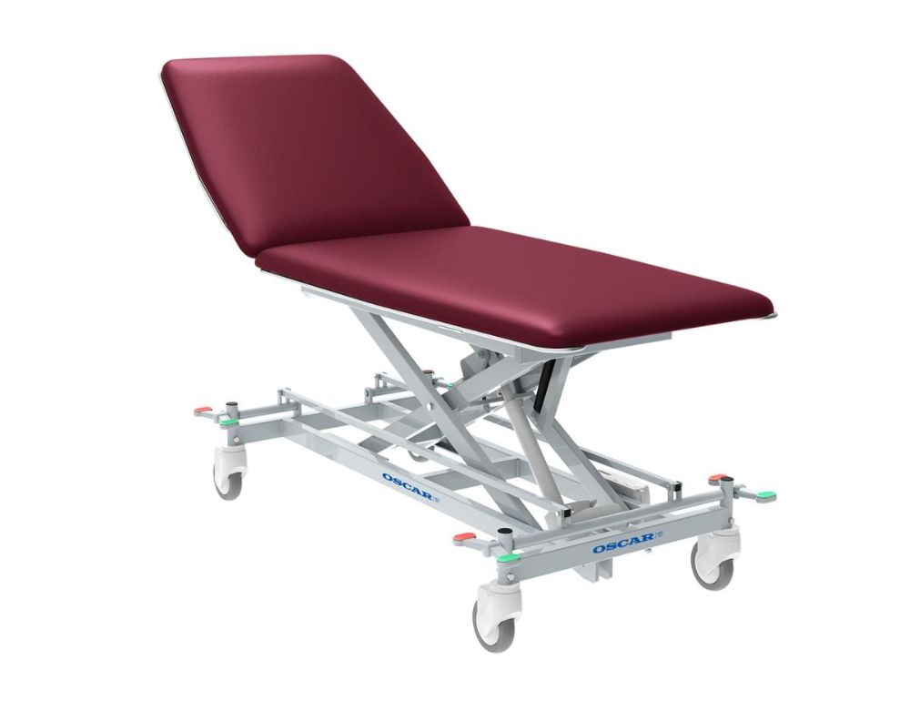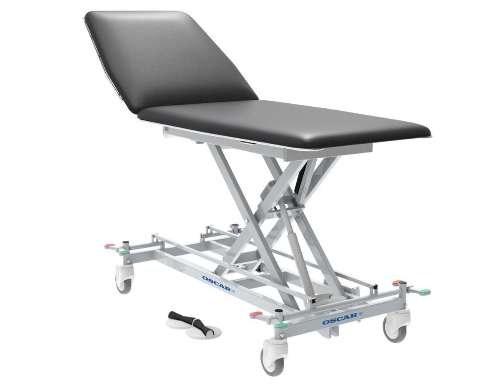 Premium undersøgelsesleje med elektrisk betjent højde og ryglæn samt centrallåste hjul, der betjenes via fodpedal. Lejet er udført i et enkelt og robust design til patientvægt på 200 kg. Ekstra lav indstigningshøjde på kun 45 cm. Mulighed for Trendelenburg-position (chock-position).