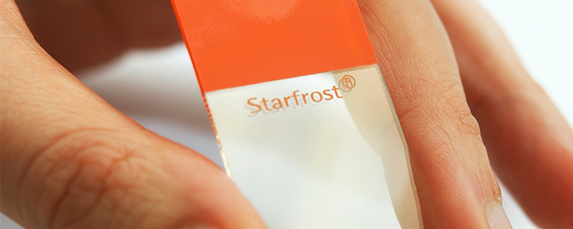Knittel-Glass' varemærkeregistrerede StarFrost® objektglas fås i adskillige uslebne og slebne varianter (bl.a. 45° og 90°), i forskellige farver og i skræddersyede designs, der imødekommer ethvert behov indenfor mikroskopi. Som officiel Knittel-Glass forhandler, tilbyder Hounisen hele porteføljen indenfor SuperStar® objektglas i Danmark.