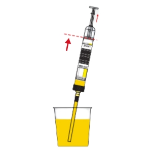 Sæt indsamlingsspidsen ned i urinprøven, og sug urinen op i Urin-Monovetten® ved at trække det medfølgende stempel tilbage til stoplinjen på røret.