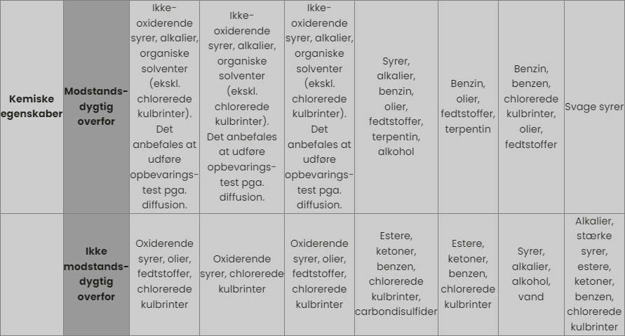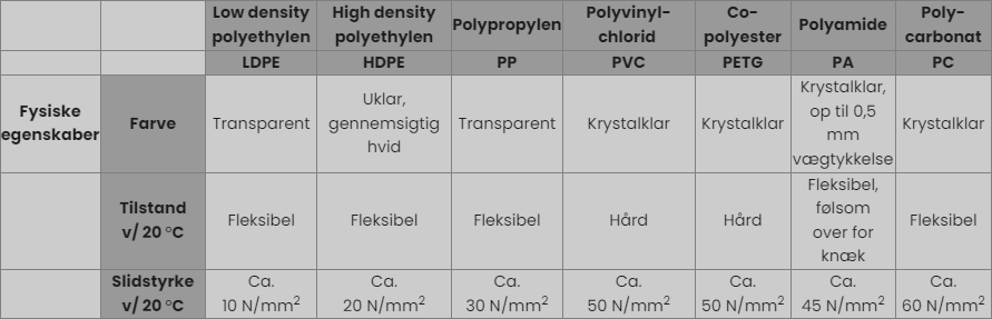 Du kan med fordel orientere dig i nedenstående skema med en oversigt over egenskaber for LDPE, HDPE, PP, PVC og PETG